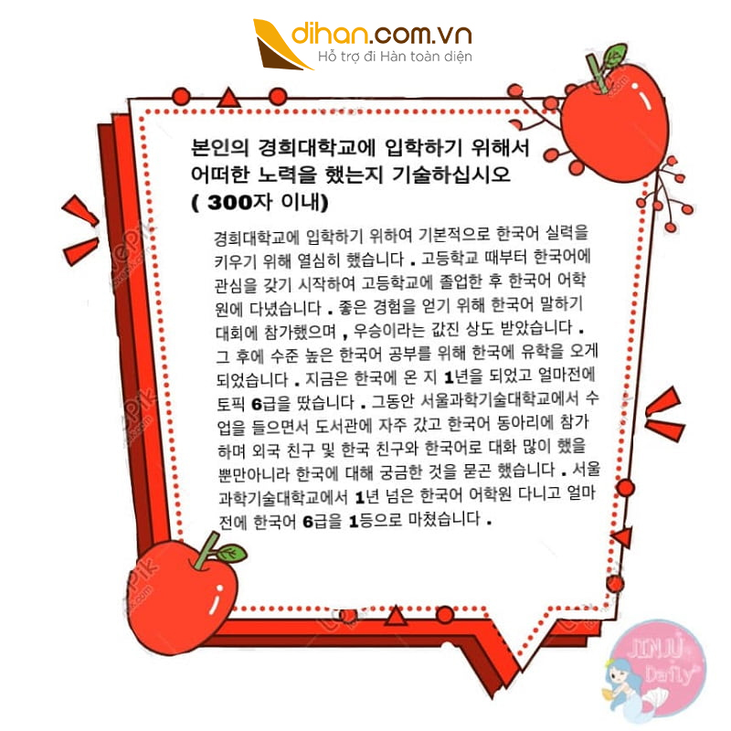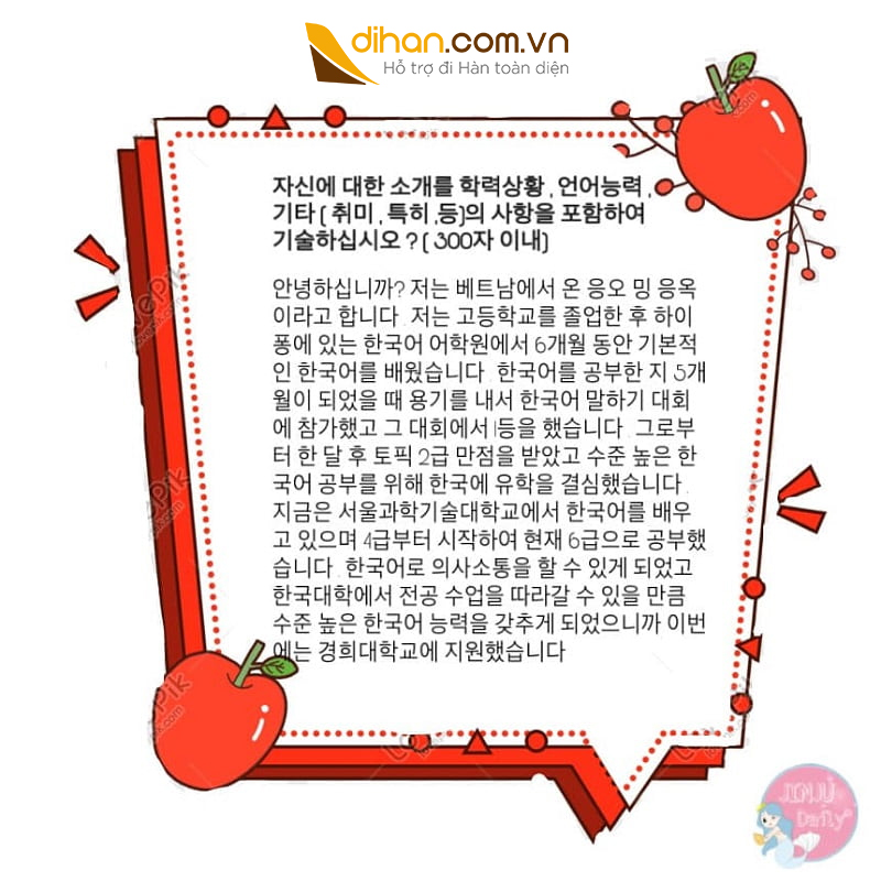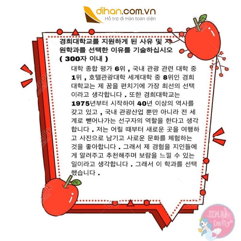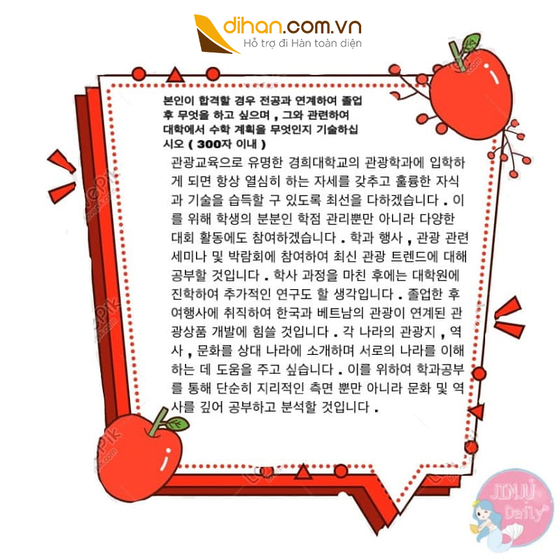 Trên đây là cách viết lời giới thiệu bản thân và bản kế hoạch học tập du học Hàn Quốc từ blog Jinju Daily. Nếu bạn nào quan tâm các thông tin tại Hàn Quốc và cuộc sống thường nhật của du học sinh có thể ghé qua Jinju Daily. Bạn chủ blog vừa xinh gái mà lại thân thiện sẽ trả lời các câu hỏi thắc mắc mà các bạn đang gặp phải.