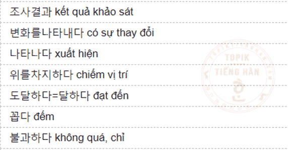 Vì mẫu câu nhận xét biểu đồ TOPIK thường có cấu trúc bài làm giống nhau, dẫn đến có một số từ vựng nhất định sẽ cần dùng đến. Nếu thuộc lòng sẽ dễ dàng hơn khi làm bài thi. Một số từ vựng chắc chắn sẽ sử dụng như sau: