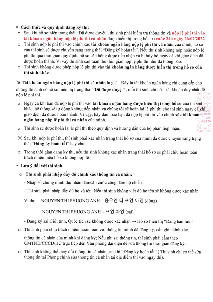 Từ năm 2022, tất cả các thí sinh đăng ký thi trong thời gian quy định sẽ được tham gia thi mà không giới hạn số lượng người đăng ký. Kỳ thi dự kiến sẽ được tổ chức tại khu vực: Hà Nội, Hải Phòng, Đà Nẵng, Huế. Sau khi được duyệt hồ sơ, thí sinh phải nộp lệ phí thi qua tài khoản ngân hàng nộp lệ phí thí các nhân được hiển thị trong hồ sơ đăng ký của mình trước 24h ngày 26/07/2022.(Không nhận lệ phí thi trực tiếp)