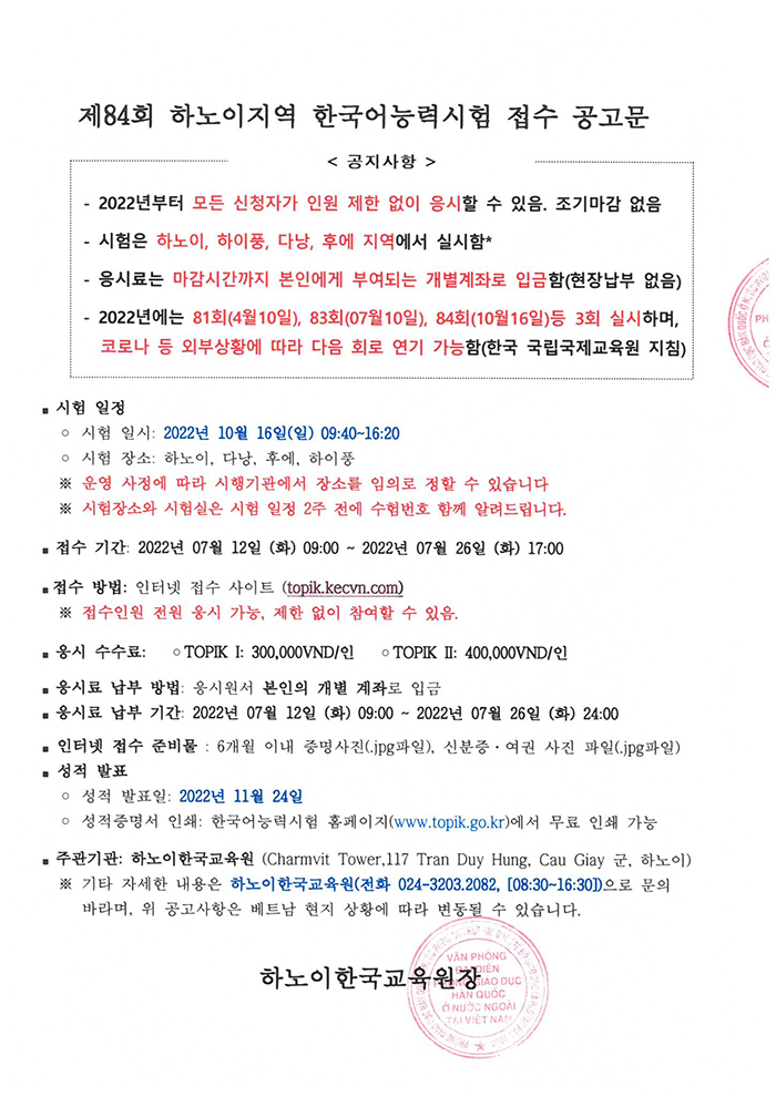 - [THÔNG BÁO MỚI] Thời gian đăng ký kỳ thi Năng lực tiếng Hàn TOPIK lần thứ 84 tại khu vực Hà Nội