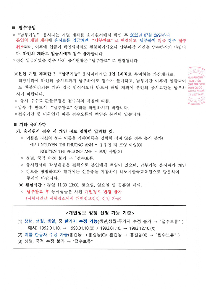 – Thời gian nộp lệ phí thi: Từ 09:00 ngày 120.07.2022(thứ Ba) đến 24:00 ngày 26.07.2022(thứ Ba)