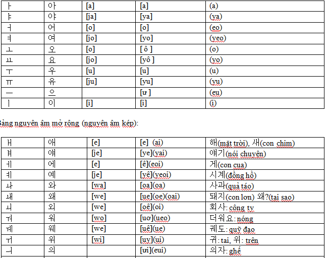 Chữ Hangeul có 21 nguyên âm, trong đó có 10 nguyên âm cơ bản và 11 nguyên âm mở rộng(còn gọi là nguyên âm kép). Nguyên âm được viết theo trình tự trên dưới, trước sau, trái trước phải sau.