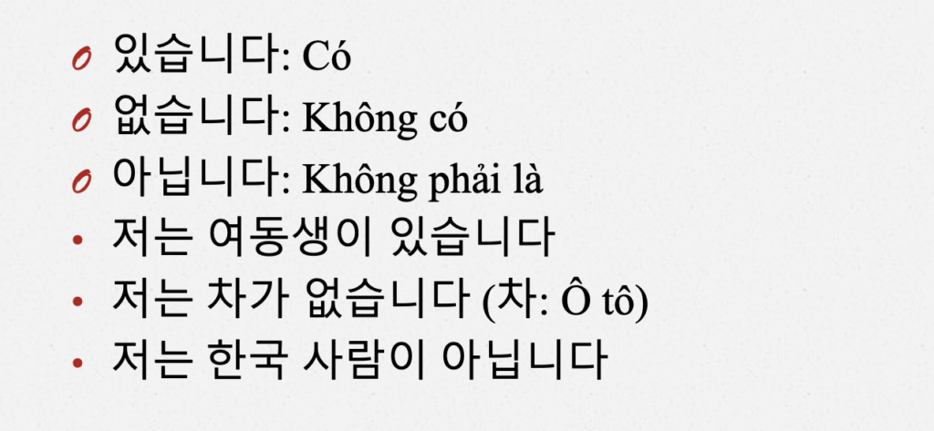 이/가 있습니다/ 없습니다/ 아닙니다: Có/ không có/ k phải là